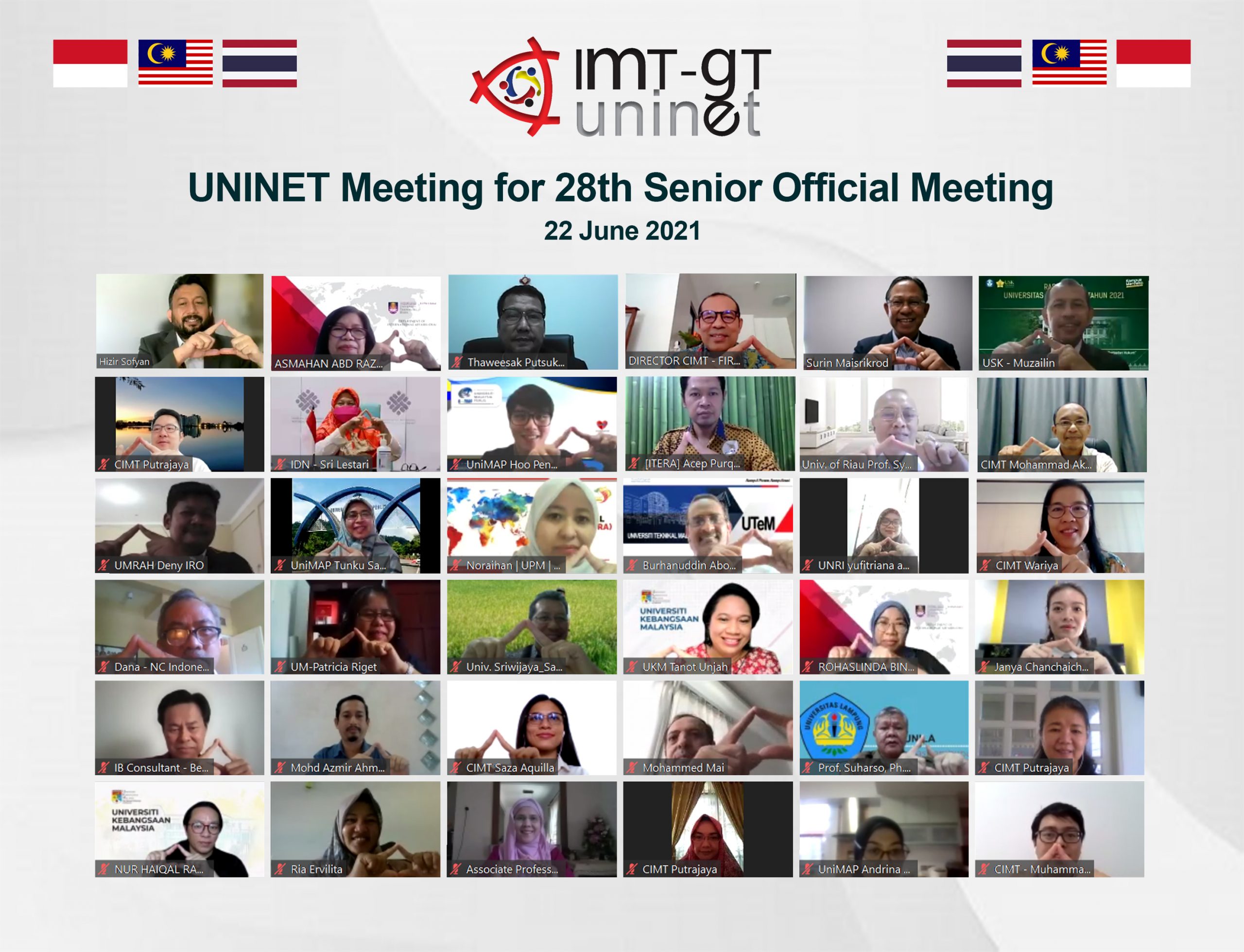 The IMT-GT UNINET Chapter Meeting For The 28th IMT-GT Senior Officials Meeting was convened virtually on Tuesday, 22 June 2021. This meeting is focused on the UNINET follow-up actions and activity, SOM/MM Meeting Preparation and date and venue of the next meeting. The Standing Chairman is from Head of Delegation Indonesia, Prof. Dr. Hizir Sofyan (Vice-Rector for Planning, Cooperation, and Public Relation Affairs, Syiah Kuala University). The meeting also attends by the Head of Delegation Malaysia, Dr. Hajah Zainab Mohd Noor (Director Office of International Affairs, Universiti Teknologi Mara), Head of Delegation Thailand, Dr. Thaweesak Putsukee (Assistant to the President for International Relations, Thaksin University), Mr. Firdaus Dahlan (Director of CIMT), and UNINET Members.