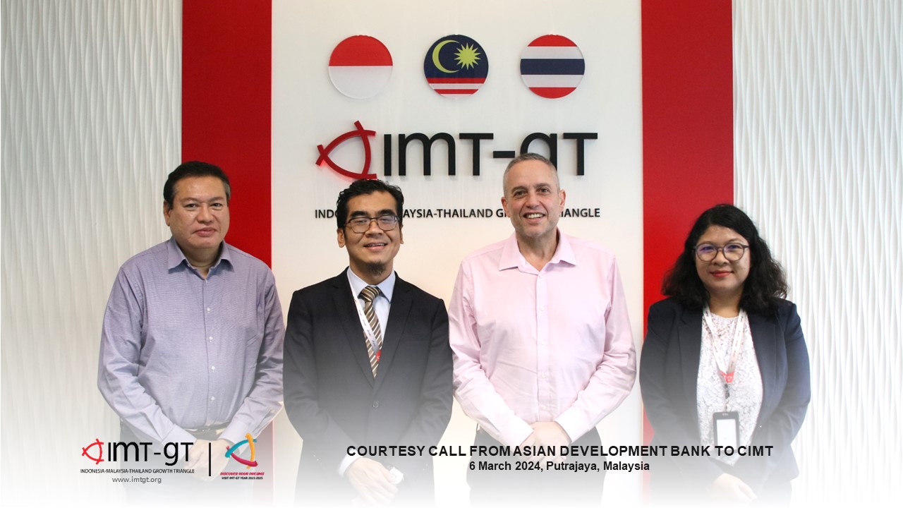On 6 March 2024, Director for CIMT, Mr. Amri Bukhairi Bakhtiar, received a courtesy call from Mr. Alfredo Perdiguero, the Head of Regional Cooperation and Integration Unit, Southeast Asia Department of Asian Development Bank (ADB). He was joined by Mr. Gary Krishnan, Senior Country Specialist, ADB. The meeting discussed the upcoming Regional Training in Project Management organised by the ADB, scheduled to take place in May 2024 in Bangkok, Thailand. Additionally, the discussions focused on the upcoming 17th IMT-GT Strategic Planning Meeting and plans to enhance the development of economic corridors in the sub-region.