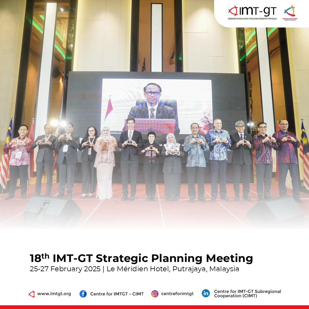 The Indonesia-Malaysia-Thailand Growth Triangle (IMT-GT) Subregional Cooperation successfully convened its 18th IMT-GT Strategic Planning Meeting (SPM) from 25-27 February 2025 in Putrajaya, Malaysia. The meeting was hosted and chaired by Malaysia, with participation of delegates from Indonesia and Thailand. The event featured eight Working Group breakout sessions, as well as discussions with the Joint Business Council (JBC) and IMT-GT University Network (UNINET).