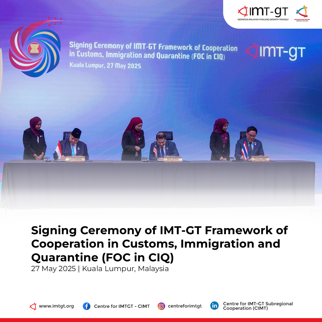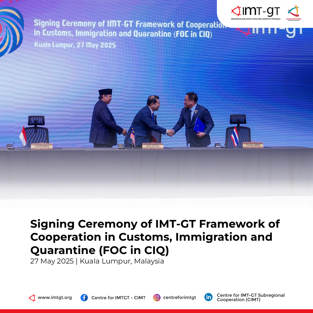 The Indonesia-Malaysia-Thailand Growth Triangle (IMT-GT) has taken a significant step toward strengthening regional integration and cross-border facilitation with the signing of the Framework of Cooperation in Customs, Immigration, and Quarantine (FOC in CIQ) on 27 May 2025, in conjunction with the 16th IMT-GT Summit. This landmark document was signed by the Coordinating Minister for Economic Affairs, Republic of Indonesia; the Minister of Economy, Malaysia; and the Deputy Minister of Finance, Kingdom of Thailand.