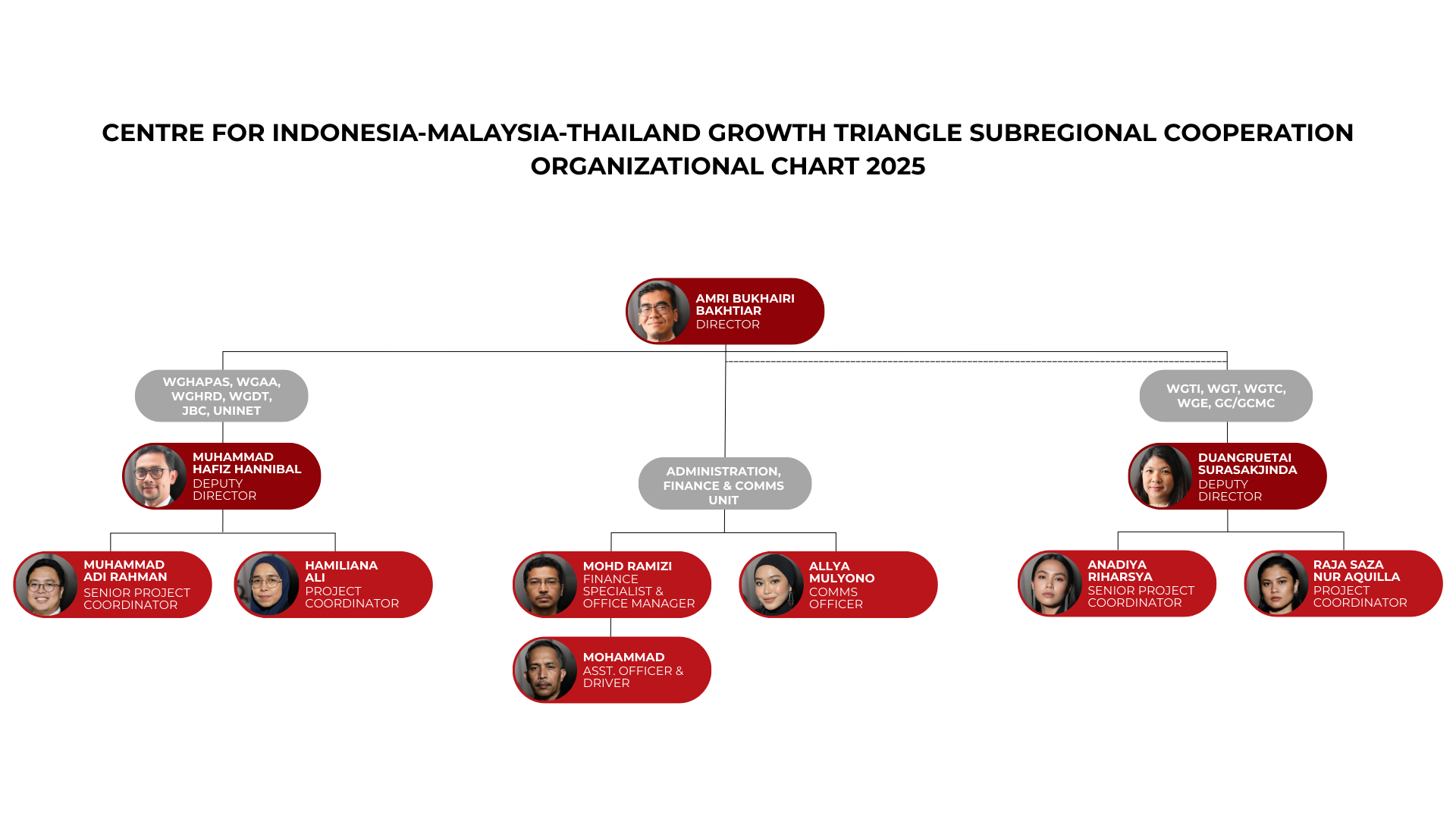 The CIMT Senior Management Team comprises representatives from the three member countries: Indonesia, Malaysia, and Thailand. The position of Director and Deputy Directors are selected and nominated by member countries according to alphabetical rotation to ensure balanced leadership and shared ownership within the subregion.